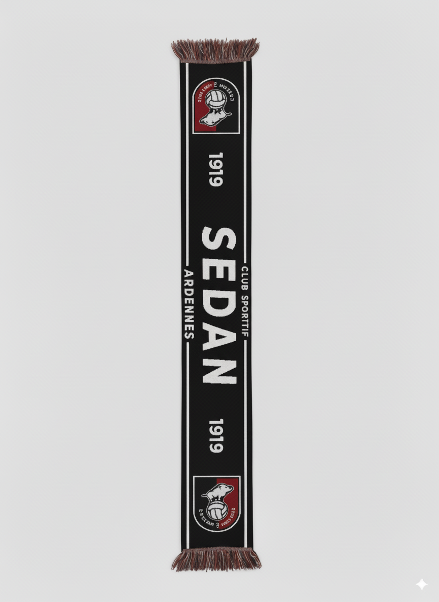 Écharpe noire élégante avec franges bicolores, mettant en avant l’inscription SEDAN 1919 au centre et le logo du club à chaque extrémité. Un design sobre et intemporel pour afficher fièrement votre attachement au CS Sedan Ardennes.