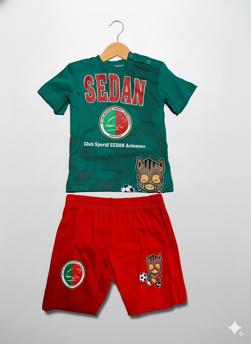 Cet ensemble pyjama bébé du CSSA comprend un haut vert décoré du logo du club, du nom SEDAN en grand et d’une illustration adorable de la mascotte sanglier. Les pressions à l’épaule permettent un habillage facile et pratique pour les tout-petits.